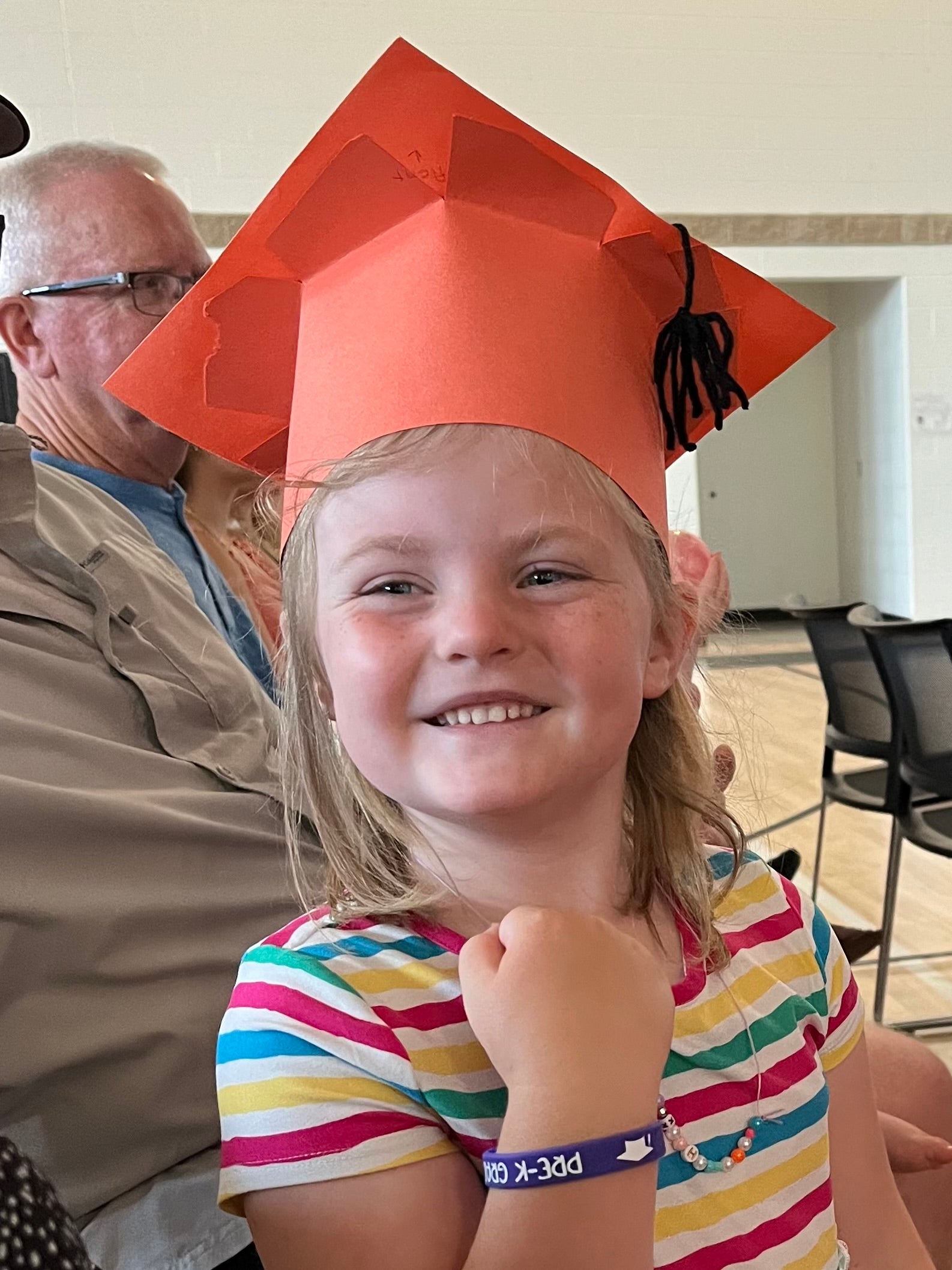 My granddaughter Evelyn (age 5), proudly showing me her new wristband from Jackson Center School PreK graduation last year.