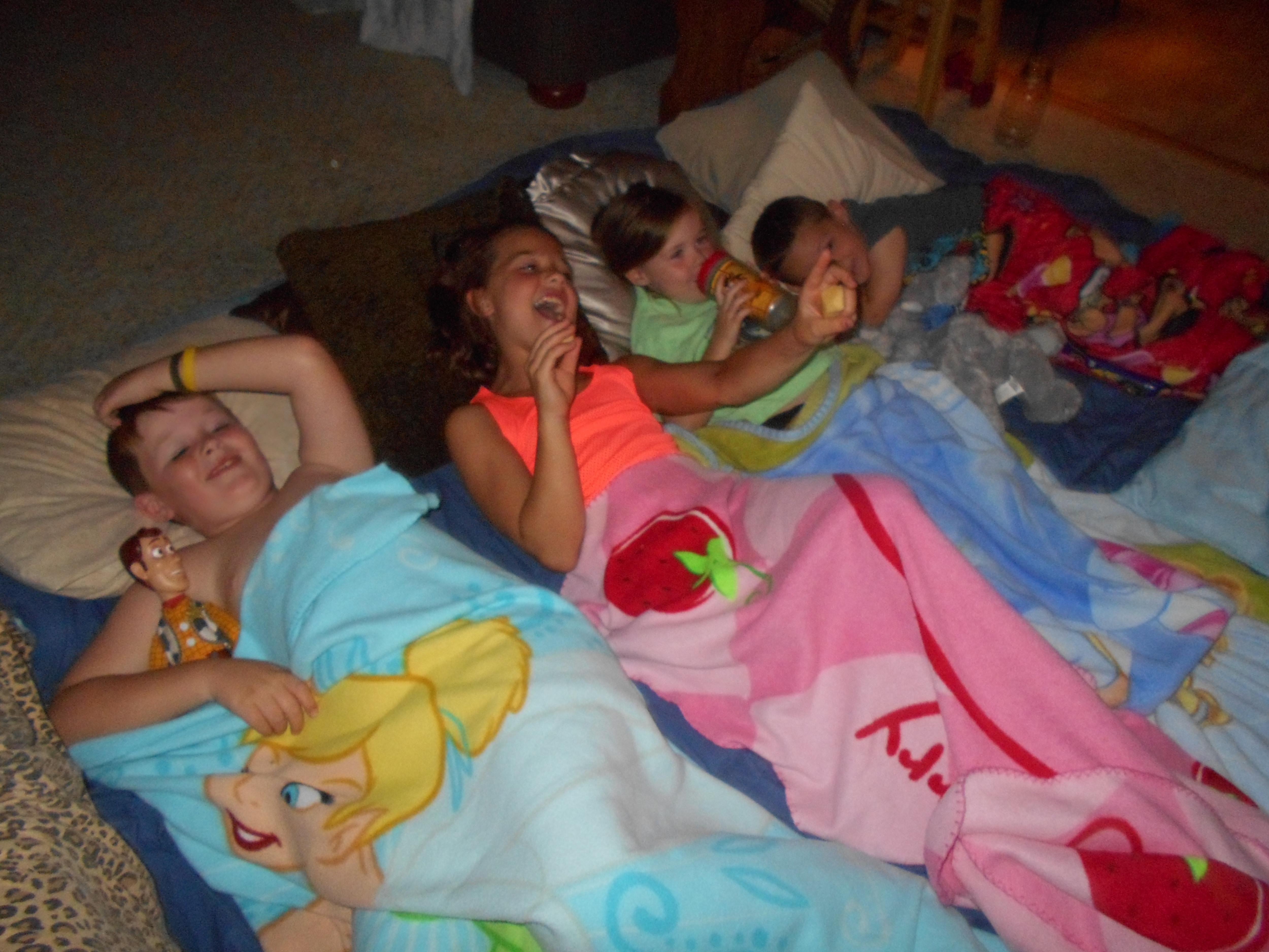 Grandchildren Austin, Piper, Addie, and Pierson watching a funny movie before bed while spending the night.