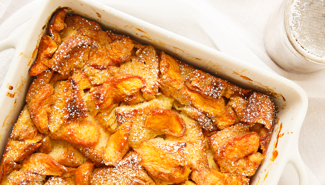 Preheat oven to 375 F. Coat an 8x8-inch baking dish (or double recipe for a 9x13-inch dish) with cooking spray and fill with bread. For a firmer pudding, toast bread in oven for 10 to 15 minutes (optional). Meanwhile, in a small bowl, coat peaches with lemon juice; set aside. In a medium bowl, whisk together eggs, sugar, cream, milk, vanilla, cinnamon, and nutmeg. With a slotted spoon, spread peaches over bread, then pour remaining juice across the top. Pour in egg mixture, ensuring all bread visible on top has been coated with liquid, then pour the rest into the crevices. Press down with a spatula so bread soaks up liquid. Bake 55 to 65 minutes, until tips of bread are toasted brown and center is firm when pressed down upon. Dust with powdered sugar (optional) and serve warm.