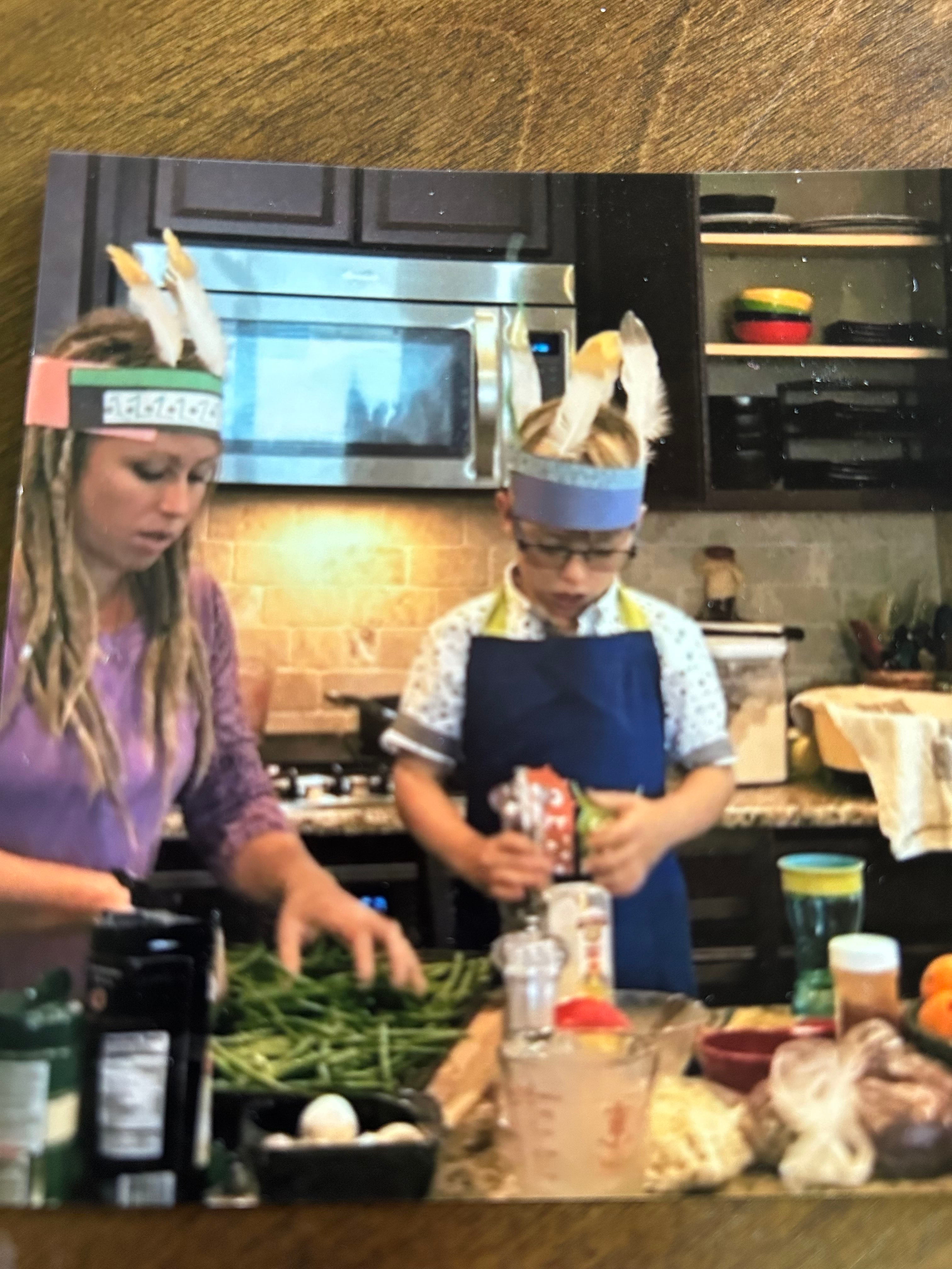 My daughter-in-law and grandson prepare the Thanksgiving feast.