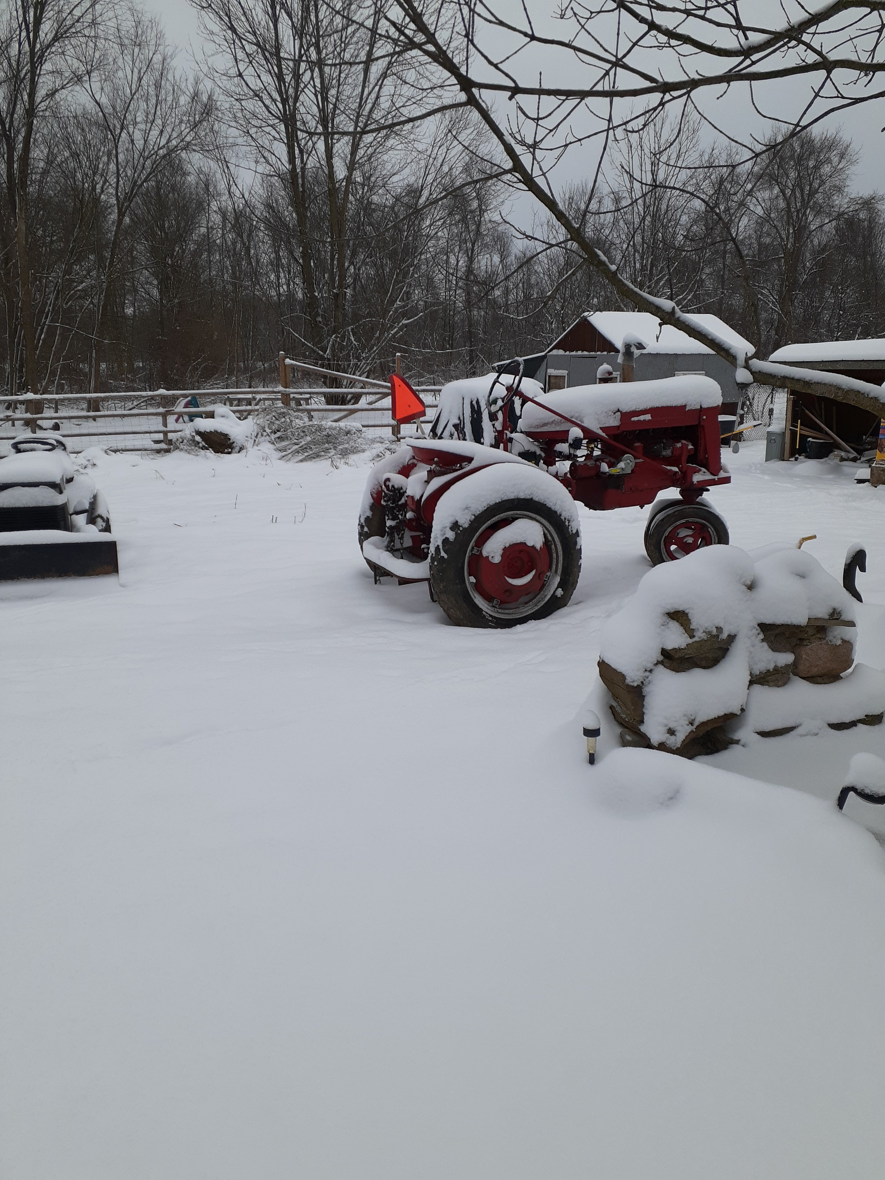 Christmas Day 2020, first snow that year. It's of our pond and shows our tractor.