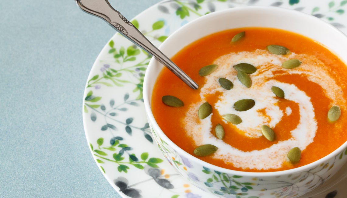 Place steamer basket into a pot and add water, leaving an inch or two of space below the steamer. Bring water to a boil, then lower temperature to medium. Add carrots to basket; cover with lid and steam 12 to 15 minutes, until easily pierced with fork yet shape stays intact. Transfer carrots to a strainer, then add onion to steamer and top with grated ginger; steam until onion is soft and translucent, about 5 minutes. With a blender or food processor, blend together carrots, onion, ginger, and a cup or so of vegetable broth until smooth. Transfer to a pot over medium heat; stir in remaining broth, lemon juice, and spices. Add a bit of water to thin, if needed. Cook until simmering. Remove from heat, swirl in coconut milk, and serve hot, topped with seeds.
