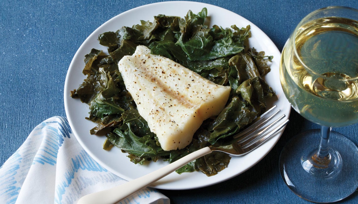 Tear leafy greens from stems. Plunge leaves in water to wash; shake until dripping slows. Rinse fish fillets and pat dry. In a deep skillet with fitted lid, melt butter on medium-low, then pour in wine and layer in garlic, greens, then fillets. Sprinkle with salt and pepper. Increase heat to medium; cover and let steam 5 minutes. Crack lid to check fish for doneness and continue steaming until fully cooked. With a large spatula, split fish and greens between two plates and spoon sauce on top.
