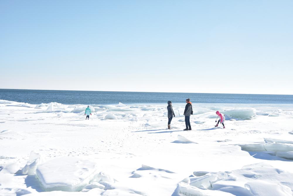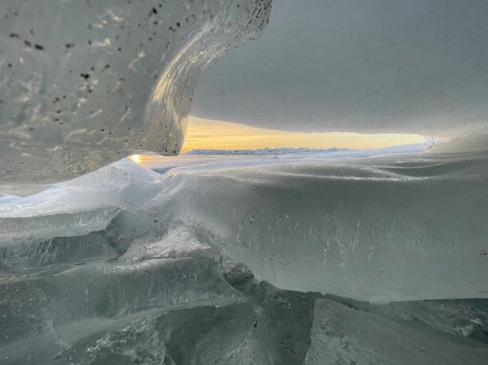 Remnants of Lake Erie’s ice hang on as late as March, with wind, waves, and warming water developing arches and caves along the shoreline.