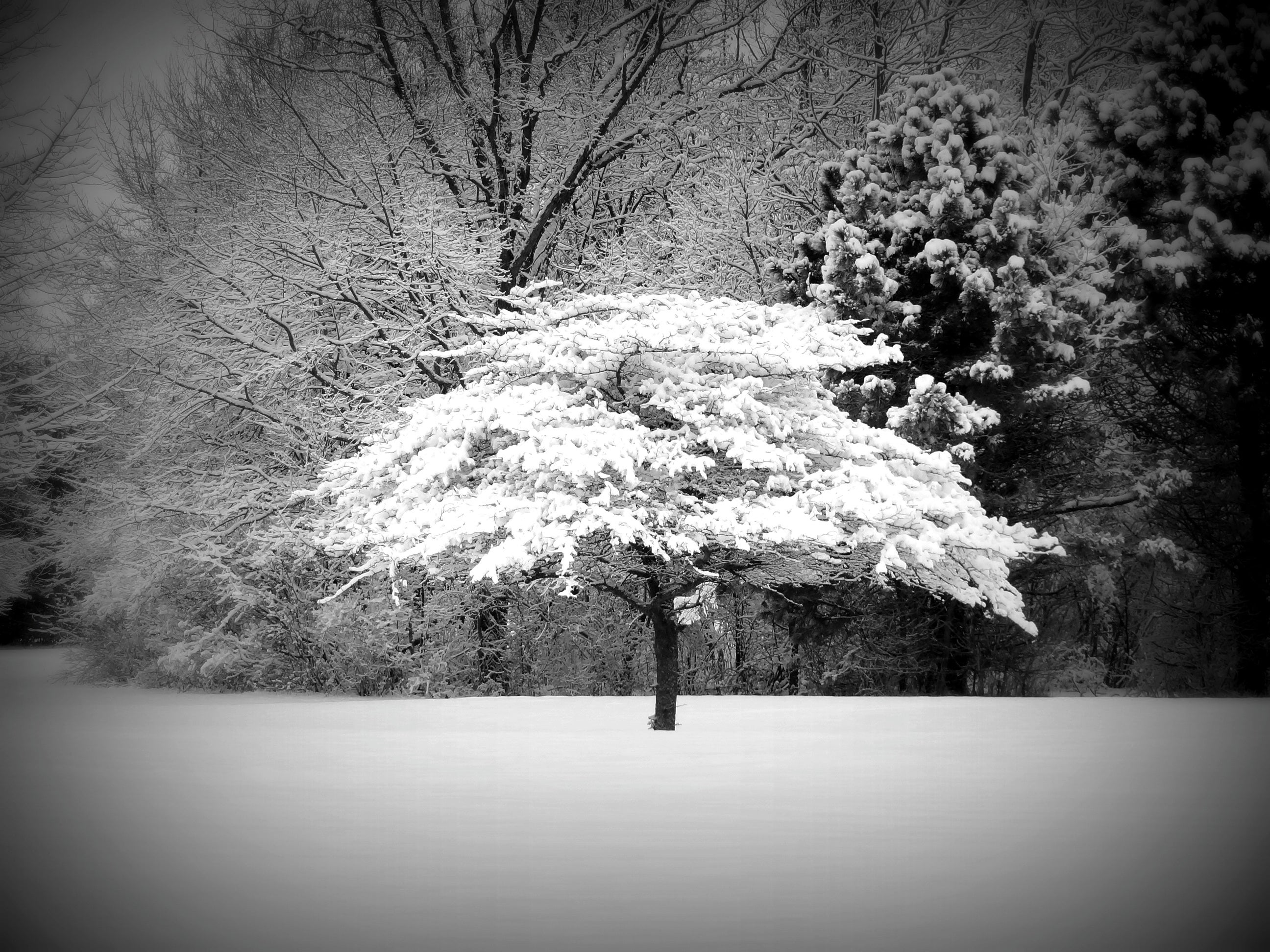 This small, beautiful tree was covered in snow and was located in a small wooded field near Lake Erie. It seemed to glow against all the other, bigger trees.
