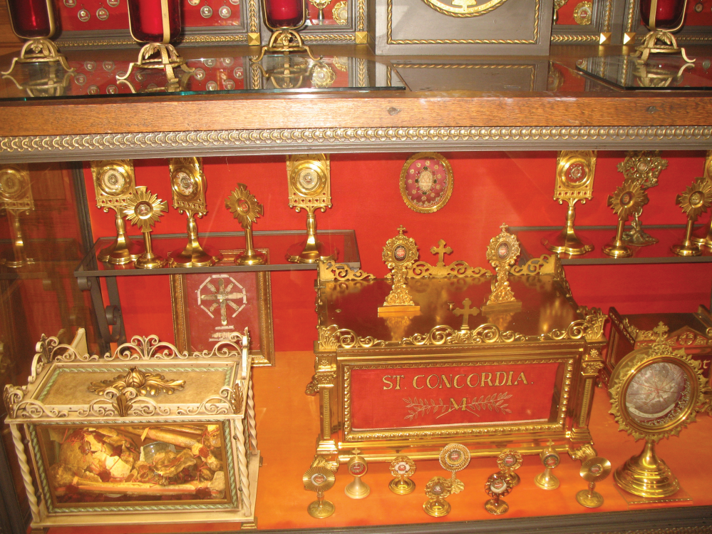 The shrine’s executive director, Mark Travis, says relics usually are objects that are associated in some way with Catholic saints, and roughly 95 percent of the collection are considered first class — meaning body parts, usually bits of bone or hair. Second-class relics are objects, such as a book or a rosary, that were touched or used by a saint; objects that have been touched by a first- or second-class relic, such as a piece of cloth, would be considered third-class. The collection also includes slivers of wood that are said to have come from the crucifixion cross and the manger of Bethlehem.