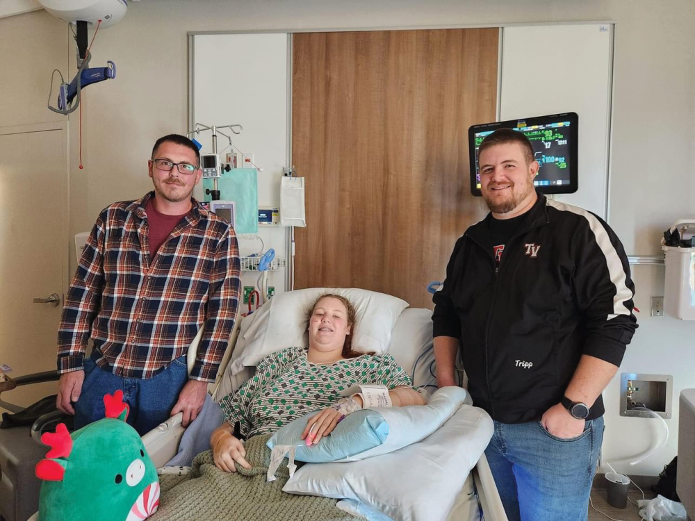 Brynn Goedel in the trauma unit in Columbus, with the two men who pulled her from the burning bus: Josh Chika, a passerby who stopped to help at the scene of the crash, and Tusky Valley band director Stephen Tripp.