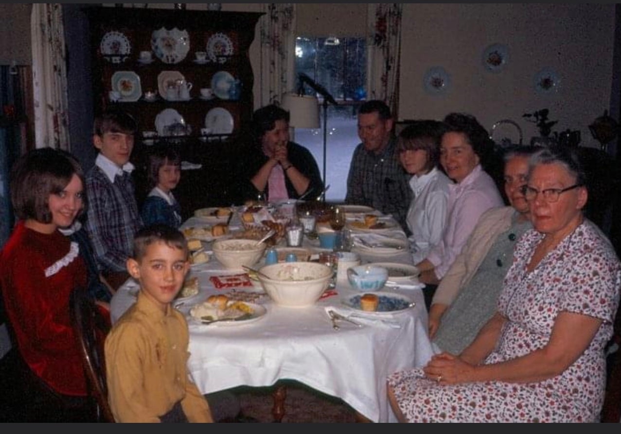Left to right around the table: Donny Shaffer, Sherry Shaffer, Bruce Roberts, Beth Shaffer, Jane Shaffer, Dick Shaffer, Debbie Shaffer, Jean Gangster, Ruth Shaffer, and Olive Shaffer.