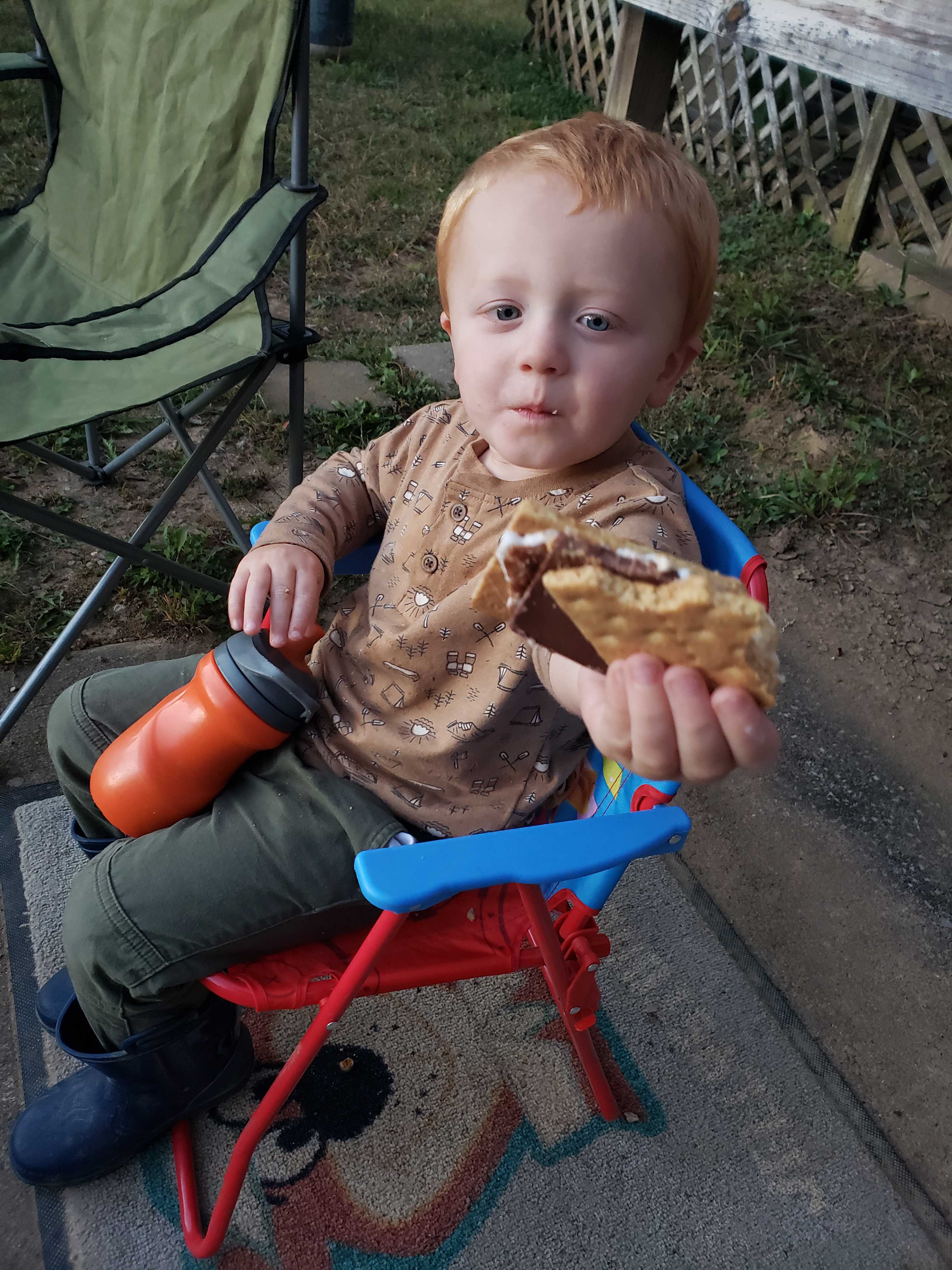 Our son, Archer, shows off his very first s’more during our family camping trip last year.