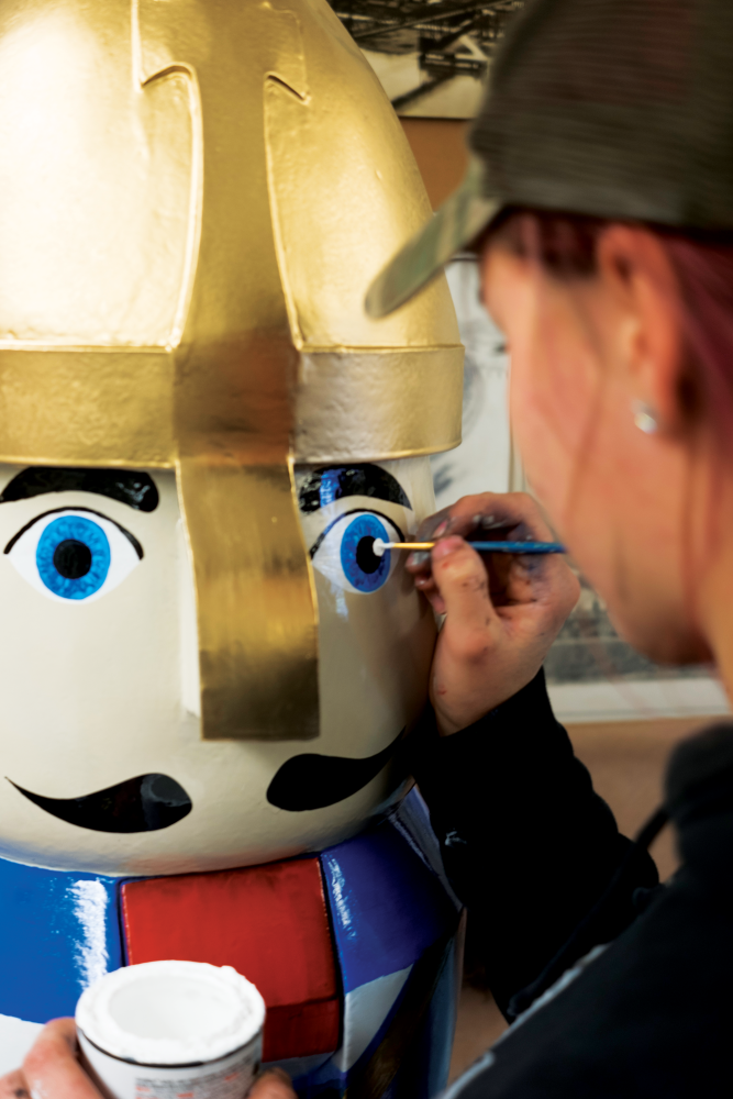 “All the added detail brings each nutcracker to life and gives it personality,” says volunteer Gretchen Nelson, while working on one of the figures with her husband, Mark. “Painting faces is the hardest part, but doing the hair can be tricky, too. Sometimes you have to take wigs apart and then glue the hair back on in layers, a few strands at a time.”