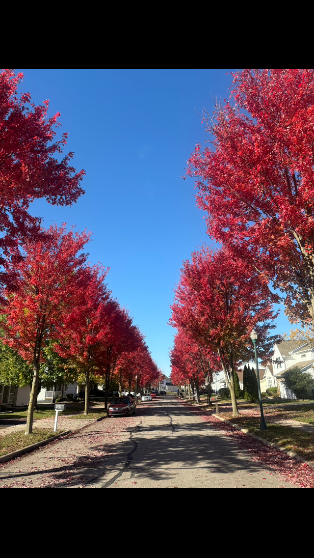 Trees ablaze with red leaves on the street where I live. Every autumn for two weeks, they all turn red like they’ve been set on fire. Also, beautiful autumn foliage in Gallant Woods on the Acorn Trail in Delaware, Ohio.