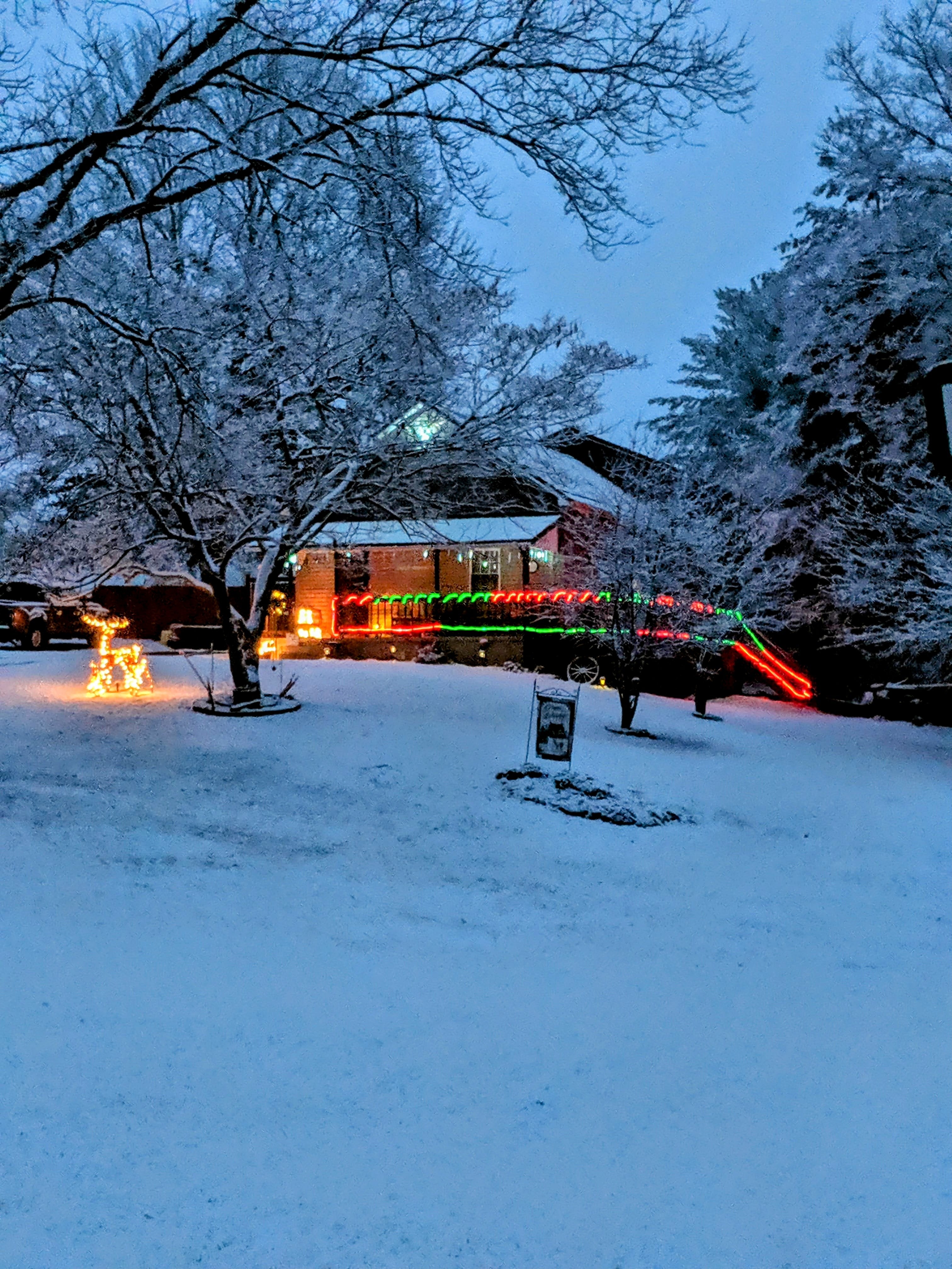 Snow-covered ground with our home decorated for Christmas in the background.