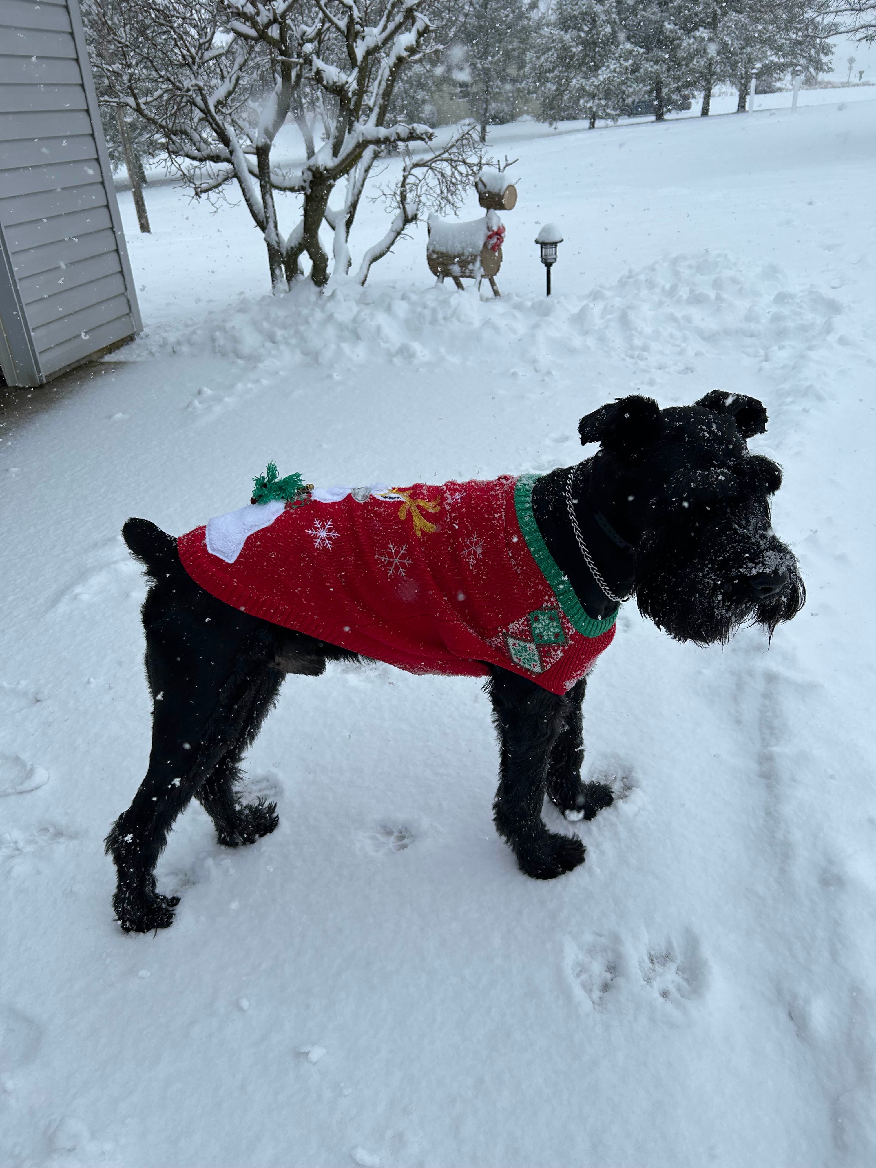 Max, our giant schnauzer, wearing his ugly Christmas sweater and playing in the snow.