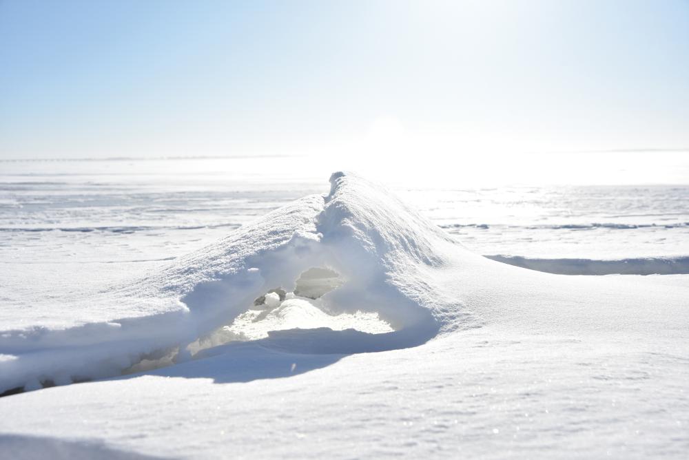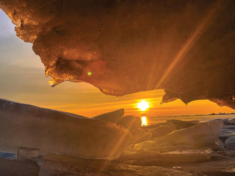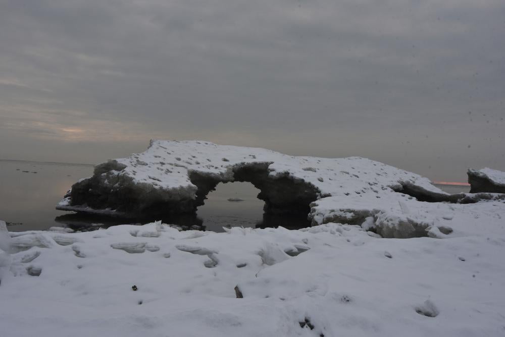 Remnants of Lake Erie’s ice hang on as late as March, with wind, waves, and warming water developing arches and caves along the shoreline.