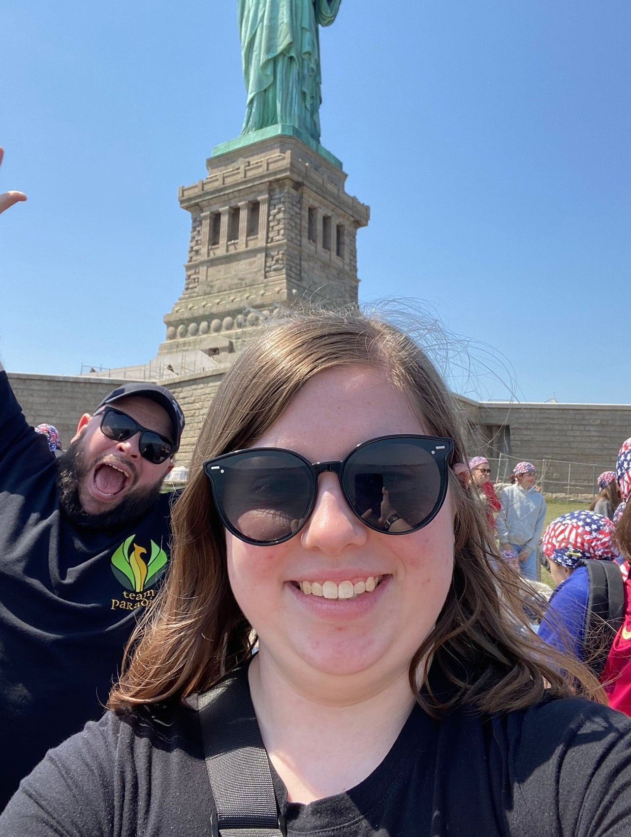 My son photo bombing my granddaughter while visiting the Statue of Liberty.