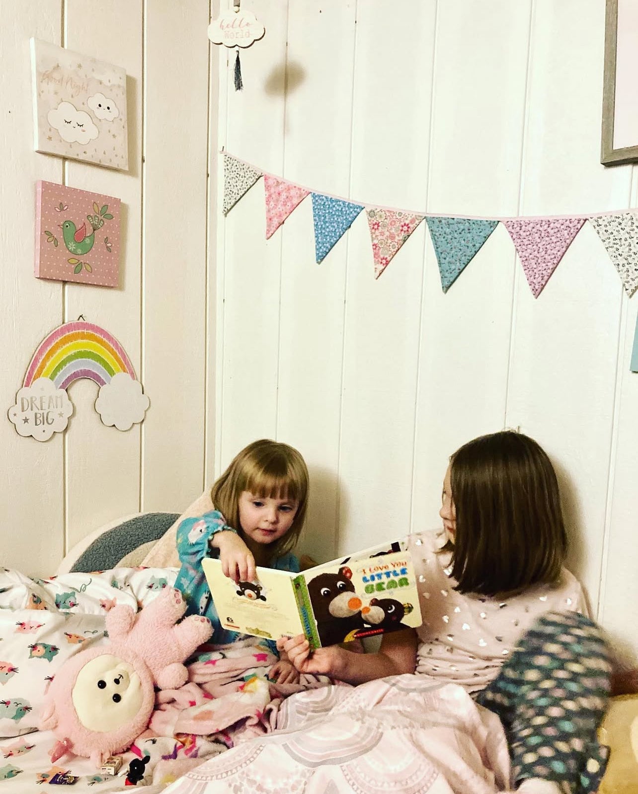 My daughter, Meadow, is reading a book to her little sister, Charlotte, before bed.
