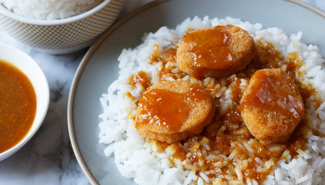 Meanwhile, in a medium saucepan, mix orange juice, orange zest, soy sauce, vinegar, brown sugar, and garlic powder. Bring to a boil over medium heat, then lower temperature a bit. Mix in cornstarch slurry and cook until sauce coats the back of a spoon. Remove from heat and cover with lid until the rice and chicken nuggets are ready. Divide rice onto plates, then top with sauce and chicken.