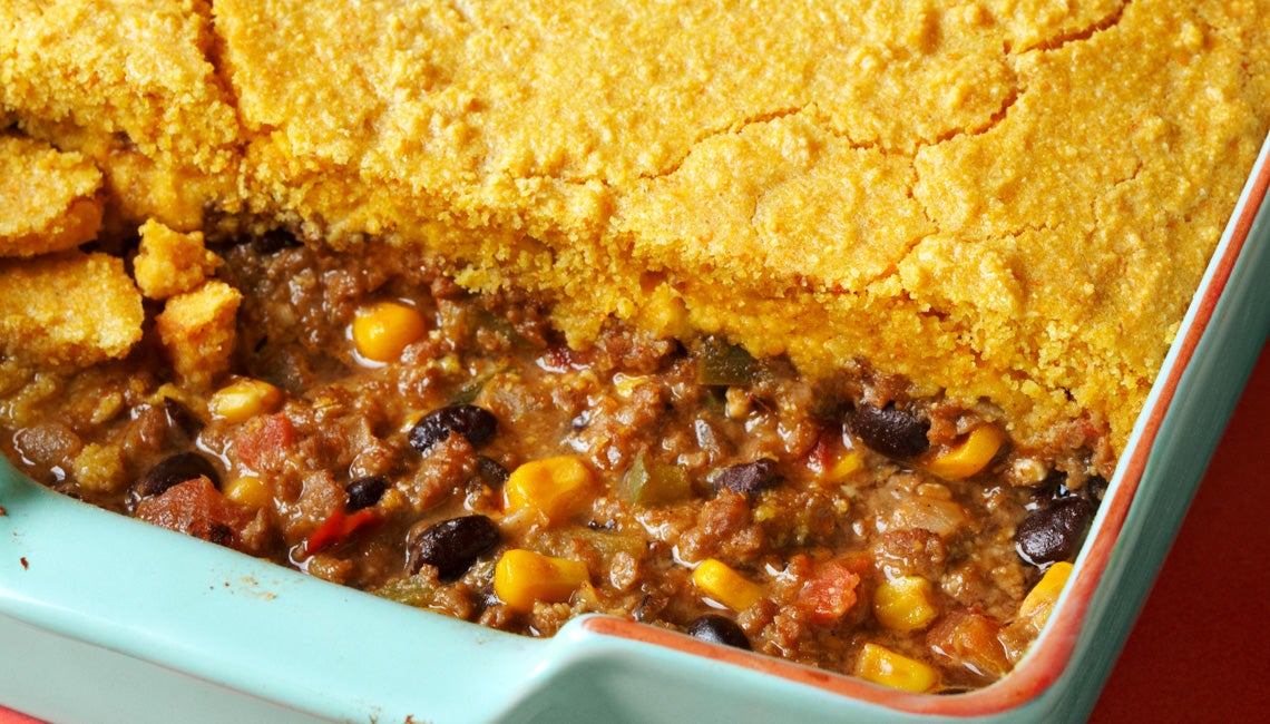 Preheat oven to 375 F. Spoon meat mixture into a greased 9x13-inch baking dish and spread cornbread mixture evenly across the top and to the edges. Bake on middle rack of oven for 18 to 20 minutes, until cornbread is golden brown and firm when pressed. Let cool a few minutes before serving.