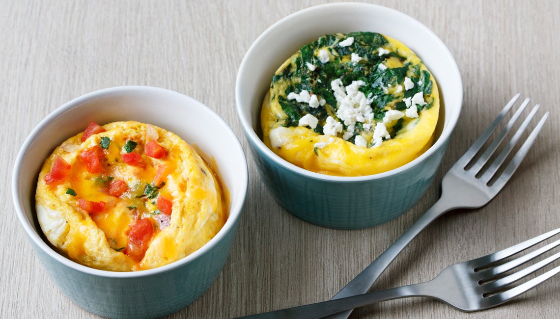 *Omelets are versatile, with countless cheese, meat, vegetable, herb, and seasoning combinations to choose from. Omelets shown have Parmesan pesto, goat cheese and spinach, and cheddar and salsa.