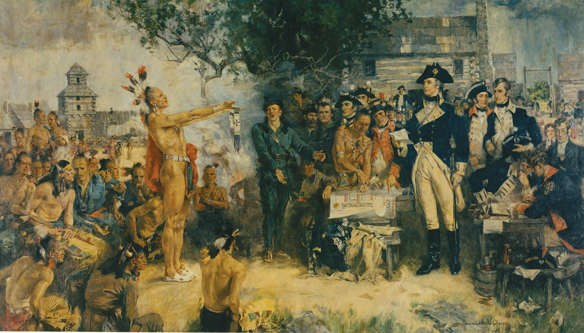 Of the many paintings hanging in the Ohio Statehouse in Columbus, the largest by far measures 22 feet long by 16 feet high and is titled The Signing of the Treaty of Green Ville. Completed in 1945 by artist Howard Chandler Christy, the painting depicts the historic 1795 meeting at Fort Greenville (today’s Greenville, Ohio) between Little Turtle, chief of the Miami Tribe, and General “Mad” Anthony Wayne, representing the United States.