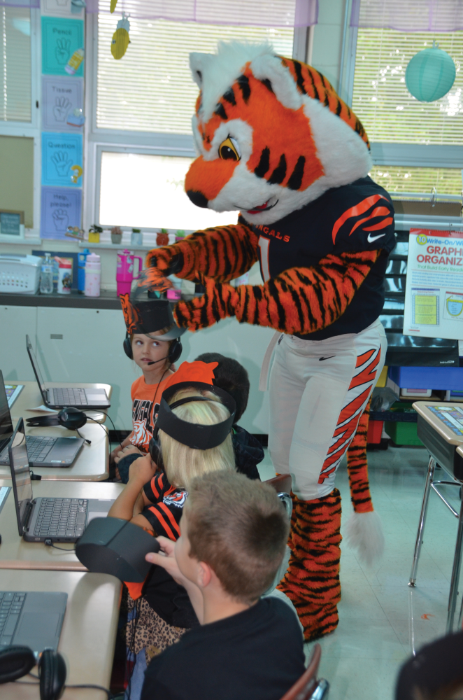 A joint effort between the NFL Foundation, the Cincinnati Bengals, and Butler Rural Electric Cooperative’s Community Connection provided funding for touchscreen Chromebooks for first-graders in Preble County. The school celebrated with the Bengals’ mascot, Who Dey.
