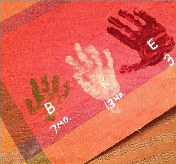 The first year we started the Thanksgiving tradition of handprints on the table runner. Now the grandkids hands have grown, we are working our way back down the table runner for Maw.
