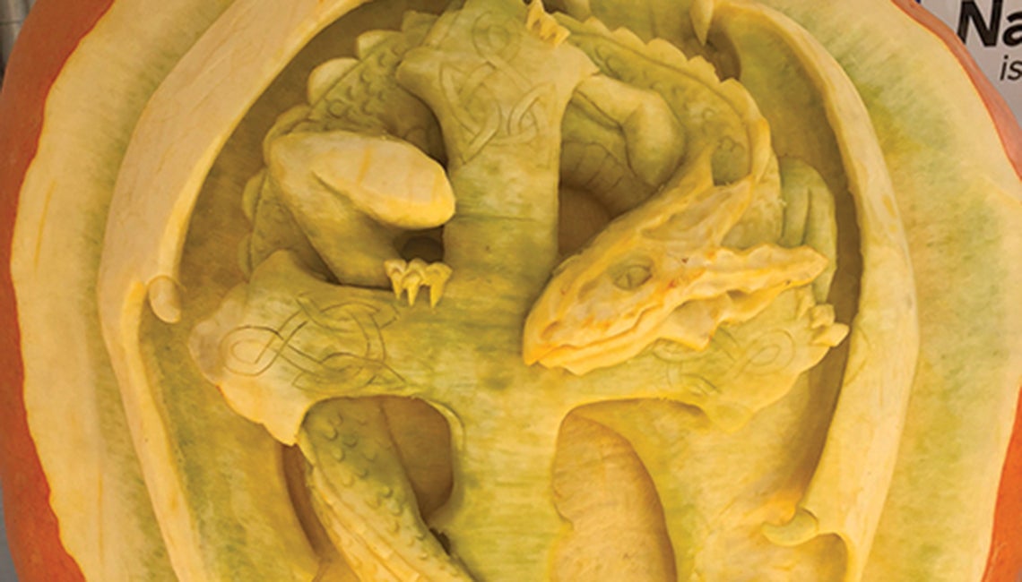 With a mix of clay-carving tools and a filet knife, Smithhisler uses a subtractive technique, taking away pieces and slivers of pumpkin skin and flesh. “I create shadows and dimension with deep cuts,” he says. The effect of his work is a performance-art-meets-static-art venture. No matter the venue, pumpkin carving is a crowd-pleaser. For Gus, interacting with the audience and giving people a turn at carving is the best part of the job.