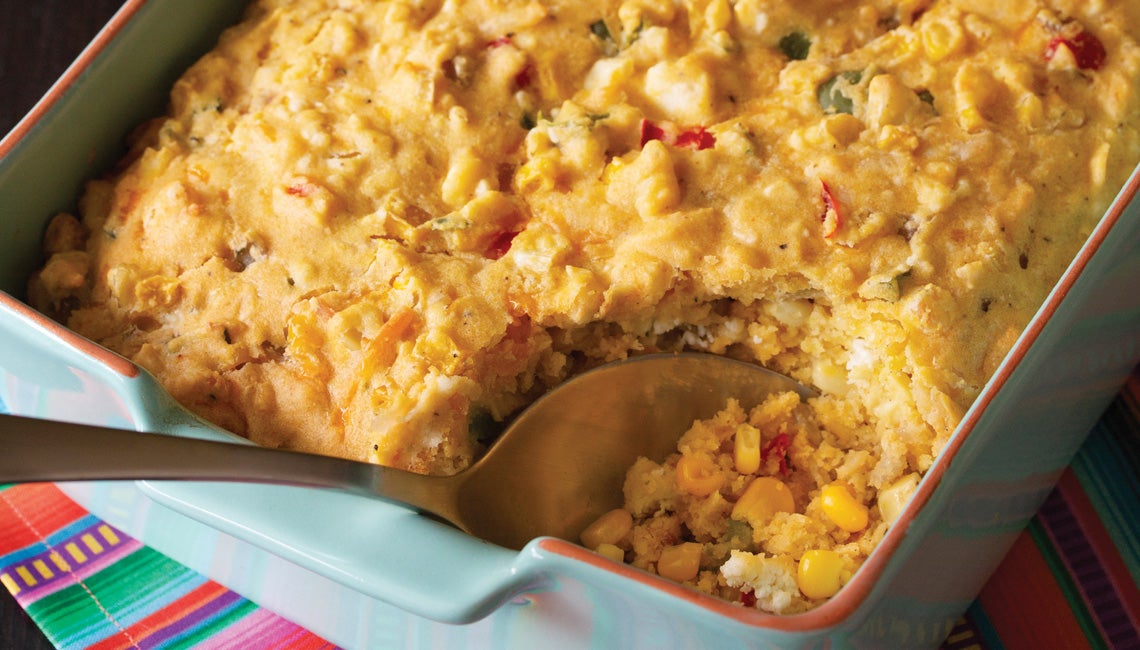 In a large skillet, sauté the onion, red pepper, green pepper, and jalapeño in olive oil until onion is translucent, about 5 to 7 minutes. Set aside. Preheat oven to 350 F. In a large bowl, combine flour, baking powder, cornmeal, and spices. Add eggs, whipping cream, and melted butter. Begin whisking, slowly adding water as you go until a thick batter forms. Fold in sautéed vegetables, corn, and cheeses. Pour mixture into a 9 x 13-inch greased casserole dish. Bake uncovered for 55 to 60 minutes. Serve hot.