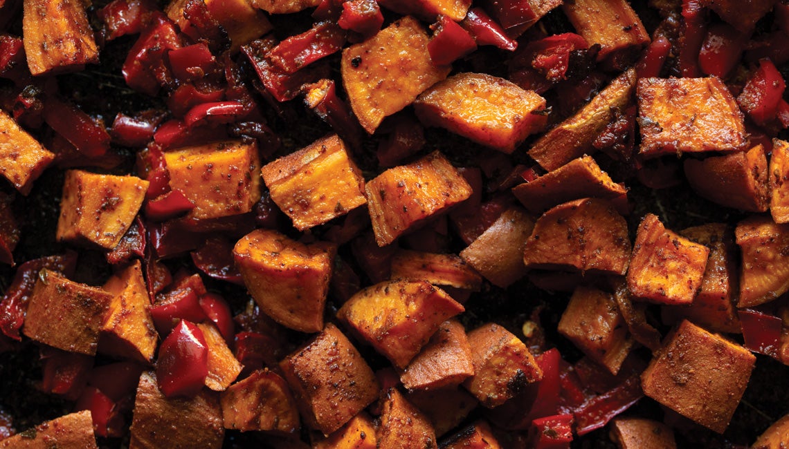 Preheat oven to 425 F. Dice sweet potatoes into chunks, somewhere between ½-inch to 1-inch pieces. In a large bowl, mix together all spices. Add diced sweet potatoes and red pepper, pouring olive oil on top. Toss together until seasoning has coated potatoes. Spread evenly in a single layer, giving the potatoes some space, on a large baking sheet and bake 25 to 30 minutes. Serve as a side dish or dress them up by topping with cheddar cheese, sour cream, bacon bits, and avocado.