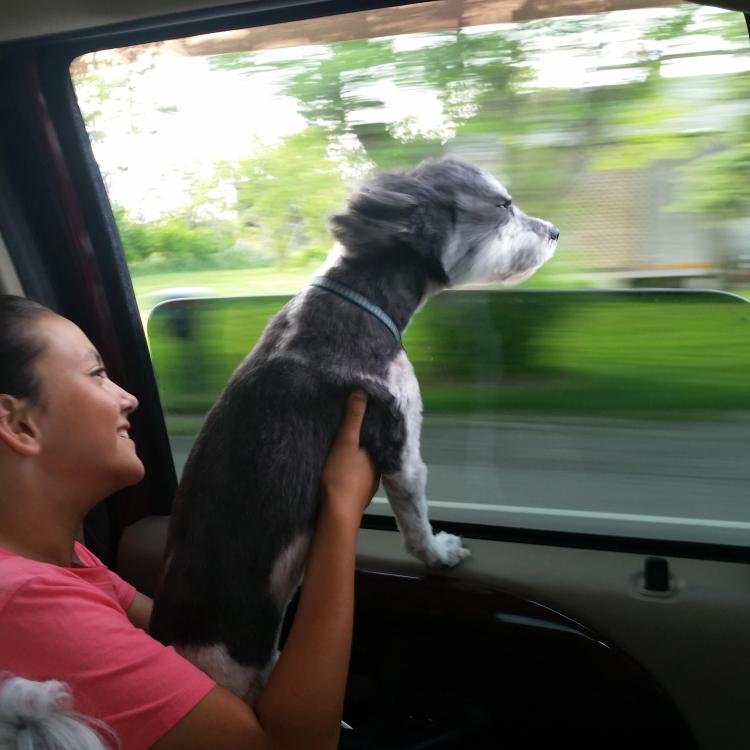 Our granddaughter, Mia, and her dog, Scout, with the wind in their hair while riding in our truck.