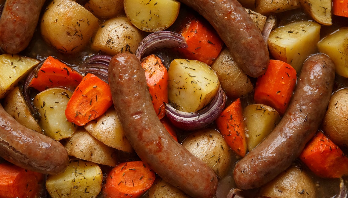 Preheat oven to 425 F. In a large roasting pan, toss potatoes, carrots, onion, and garlic with olive oil. In a medium bowl, whisk cornstarch with a small amount of the beef broth until smooth, then whisk in remaining broth. Pour broth over vegetables in roasting pan, then sprinkle with thyme, salt, and pepper. Cover pan with foil and bake 40 minutes. Pull pan out of oven and remove foil. Place sausages on top of the vegetables, leaving space between them. Bake 8 minutes, then flip sausages over and bake another 6 minutes, or until the internal temperature of the sausages reaches 160 F, vegetables are soft, and gravy is thickened.